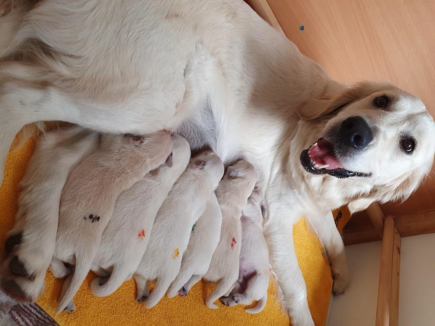 Die 1. Woche ging mit viele Höhen und Tiefen vorbei. Trinkprobleme bei einem Welpen und Bäuchleinprobleme bei einem anderen Welpen haben uns ziemlich gefordert. Jetzt hoffen wir, dass die nächsten Wochen gut verlaufen. 4 Welpen haben ihr Geburtsgewicht bereits verdreifacht ...